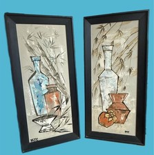 MID CENTURY MCM – Abstract Still Life Bottles & Bamboo Motif FRAMED PAIR (2)