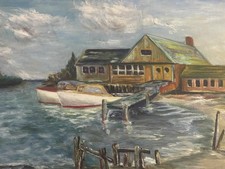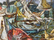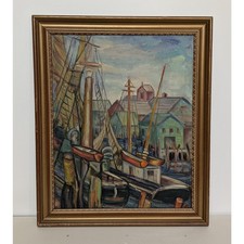 VINTAGE MID CENTURY ABSTRACT GLOUCHESTER SCHOOL NAUTICAL LANDSCAPE OIL PAINTING