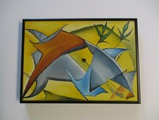 BEAUTIFUL VINTAGE MID CENTURY MODERN ABSTRACT CUBIST FISH OIL PAINTING OLD 1960