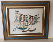 Mid-Century Modern Colorful Abstract Boat Harbor Building Painting Signed Jacobs