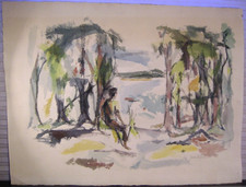 Abstract Landscape Figure MCM Mid Century Watercolor Painting