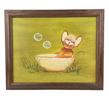 Framed Mouse Bath Painting Mid Century Style Signed 13x16" Whimsical