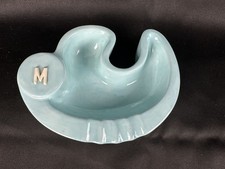 Vtg Mid-Century Modern Aqua Ceramic Ashtray Unique Curved Design "M" Letter