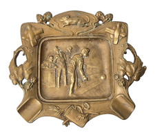 Antique Brass Ornate Cigar Ashtray w/ Men Bowling Scene 6 3/4" x 6"