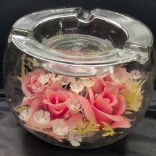 Rare Vintage Terrarium Floral Ashtray Cabbage Roses Antique Glass Retro 3d 70s