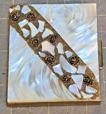 Vintage Mid Century Mother of Pearl & Brass Roses Makeup Compact Mirror Case e