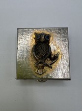 Vintage Pillbox – Small Jewel Eyed Owl Metal Hinged Box With Divider Mid Century