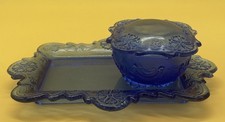 Mid Century Blue Cut Glass Vanity Set Tray Trinket Box!