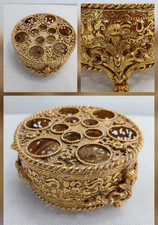 Vtg MCM 24K Gold Plated Filigree 3" Round Lidded TRINKET BOX w/ Beveled Glass