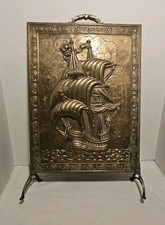Antique Vintage Fireplace Screen Brass Stand Nautical Ship Stormy Skies