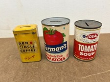 Vintage Coin Bank Lot RED CIRCLE COFFEE TIN Furman Tomato Soup Can advertising