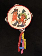 Vintage Tin Toy Tambourine Musical Instrument Cowboy Native American Indian Girl
