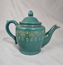 Vintage 1950's Green Hand Painted w Gold Japan Redware Pottery Music Box Teapot