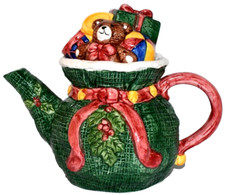 Mini Ceramic Santa Teapot Tea Pot Holding Bear and Toy Gift Bag Vintage 1990's