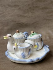Vintage Mini Ceramic Swan Tea Set On Tray Teapot Sugar Creamer Toy Set