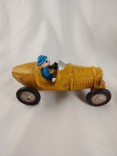 Vintage cast iron toy race car metal painted Yellow with Blue driver.