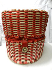 VTG 60s Red/White Wicker Hat Wig Box Locking Lid Beaded Handle Hong Kong 14" B4M