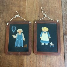 Pair Hand Painted Little Girl on Black Slate in Frames Made in Portugal