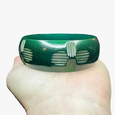 Vintage Bakelite Dark Green Semi Transparent Carved Bangle Bracelet 1" Wide RARE