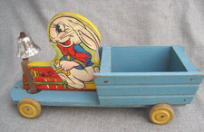 VINTAGE 1940s THE GONG BELL WOODEN PULL TOY # 271 BUNNY RABBIT w FIRE DEPT CAR