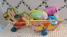 Vintage 1960 Fisher Price #312 Painted Wooden Easter Bunny🐰 Cart Pull Toy+Eggs!