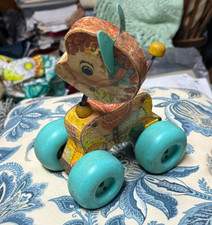 Vintage Fisher Price Kriss Kricket wood cricket pull toy #678 works READ