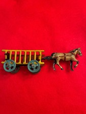 Vintage German Tin Penny Toy Horse Drawn Open Sided Yellow Cart w/ Blue Wheels