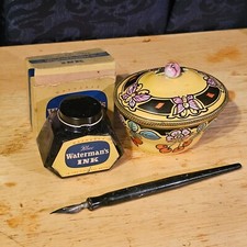 Antique Writing Utensil Ceramic Ink Well Bottle Wooden Shaft Fountain Pen Displa