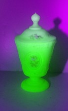 Vintage Fenton Custard Green Uranium Glass Daisy Panel Compote Candy Dish