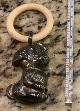 Puppy Baby Rattle Teething Ring 3 1/2” Metal Vintage Antique Silver Infant Toy