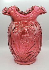 Vintage Fenton Art Glass Cranberry Daffodil Glass Vase Ruffled Crest