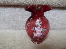 Fenton Glass Vase Mossy Rose White Satin Cranberry W Floral 7.5"
