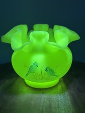 Vintage Fenton Art Satin Glass UV Glow Custard Blue Bird Rose Bowl Ruffle Vase