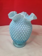 Vintage FENTON art glass - 8" tall Blue Opalescent Hobnail vase - ruffled top
