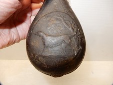 ANTIQUE CIVIL WAR ERA EMBOSSED LEATHER GUN POWDER FLASK HUNTING DOG