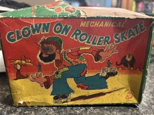VINTAGE TIN LITHO MECHANICAL WIND-UP SKATING HOBO CLOWN TOY W/BOX JAPAN 1950s