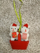 Vtg 2 Fluffy Bears In Basket Music Box Ornament Handmade
