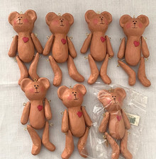 Vtg Lot of 7 Ceramic Jointed TEDDY BEAR w/ Hearts Christmas Ornaments