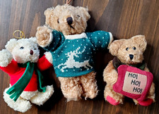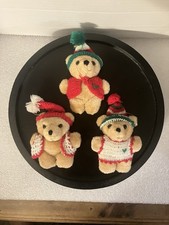 3 Vintage Teddy Bear Plush Christmas Ornaments With Hats And Vests 3.5”