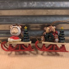 Vintage Teddy Bears On Sleds Christmas Ornaments 3" X 2 1/2" Lot Of 2 Colorful