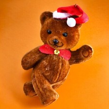 Vintage Flocked Teddy Bear Dressed as Santa Claus Ornament 3.25"H