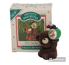 Vtg 1987 Hallmark Fuzzy Brown Bear Holding Christmas Ornament - Beary Special