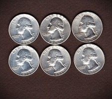 6 SILVER US WASHINGTON QUARTER DOLLAR COINS FROM A COLLECTOR ALBUM 1961-64...