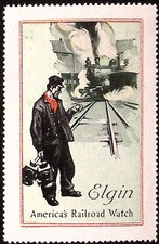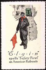 Elgin Spells Safety on American Railroads Watch Advertising Poster Stamp c1920s