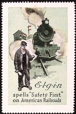 Elgin Safety First on Railroads Steam Engine Advertising Poster Stamp c1920s
