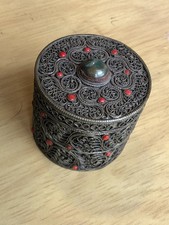 Antique Tibetan Enamel Filigree Box With Jadeite Bead, 3 1/4″ high