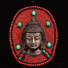 Old Tibet Buddhist Mahakala mask Gemstones Coral & Turquoise on Copper Nepal 7in