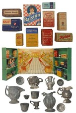 SCARCE WOLVERINE CO. VINT ENML FOLDING TIN STORE TOY, W/AD BOXES TIN POTS/PLATES
