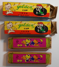 2 VINTAGE Tin Toy Wood Harmonica Hello Kitty GOLDEN CUP made in China UC519
