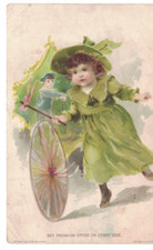 1894 WOOLSON SPICE CO. Victorian Advertising Trade Card Girl Child Wheel Toy